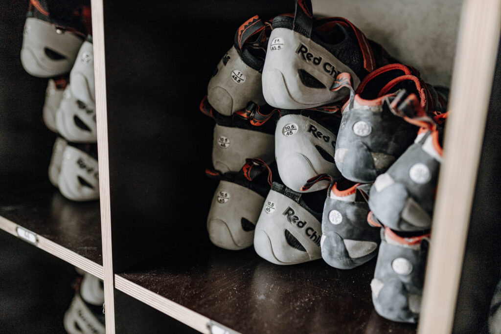 passende Schuhe. Wenn Du keine eigenen Kletterschuhe hast, kannst Du Dir bei uns welche ausleihen – ebenso wie Chalk (Magnesium), das für trockene Hände sorgt und Dir beim Klettern besseren Halt und Stabilität gibt.