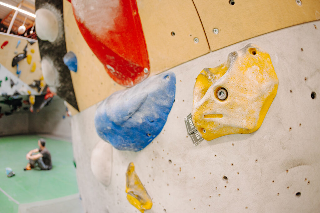 Ein Boulder setzt sich aus einer Reihe von Griffen und Tritten derselben Farbe zusammen und hat klar definierte Start- und Topgriffe.